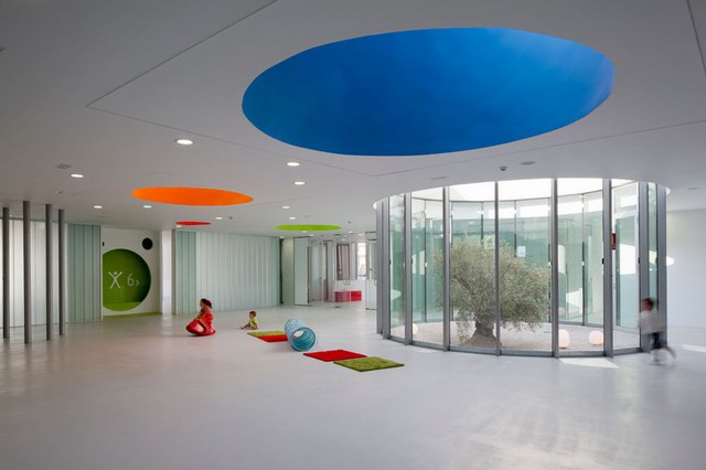 看到這個(gè)幼兒園就會(huì)讓人想起Lewis Carroll的那本著名童話故事《愛(ài)麗絲奇境漫游記》。同樣是把我們帶入一個(gè)多種感受的世界,其中融合了幻想與真實(shí)、工作與玩耍、樂(lè)趣與責(zé)任。孩子們眼中的空間,有著與成人相異的感覺(jué)、體驗(yàn)、尺度以及色彩,如果要與成人共處,就很有必要使用雙重尺度,讓每個(gè)人都能適應(yīng)環(huán)境。然而,要適應(yīng)的不僅有尺度,還有空間的感知特性。因此,我們從建筑的內(nèi)部開(kāi)始最基本的思考。