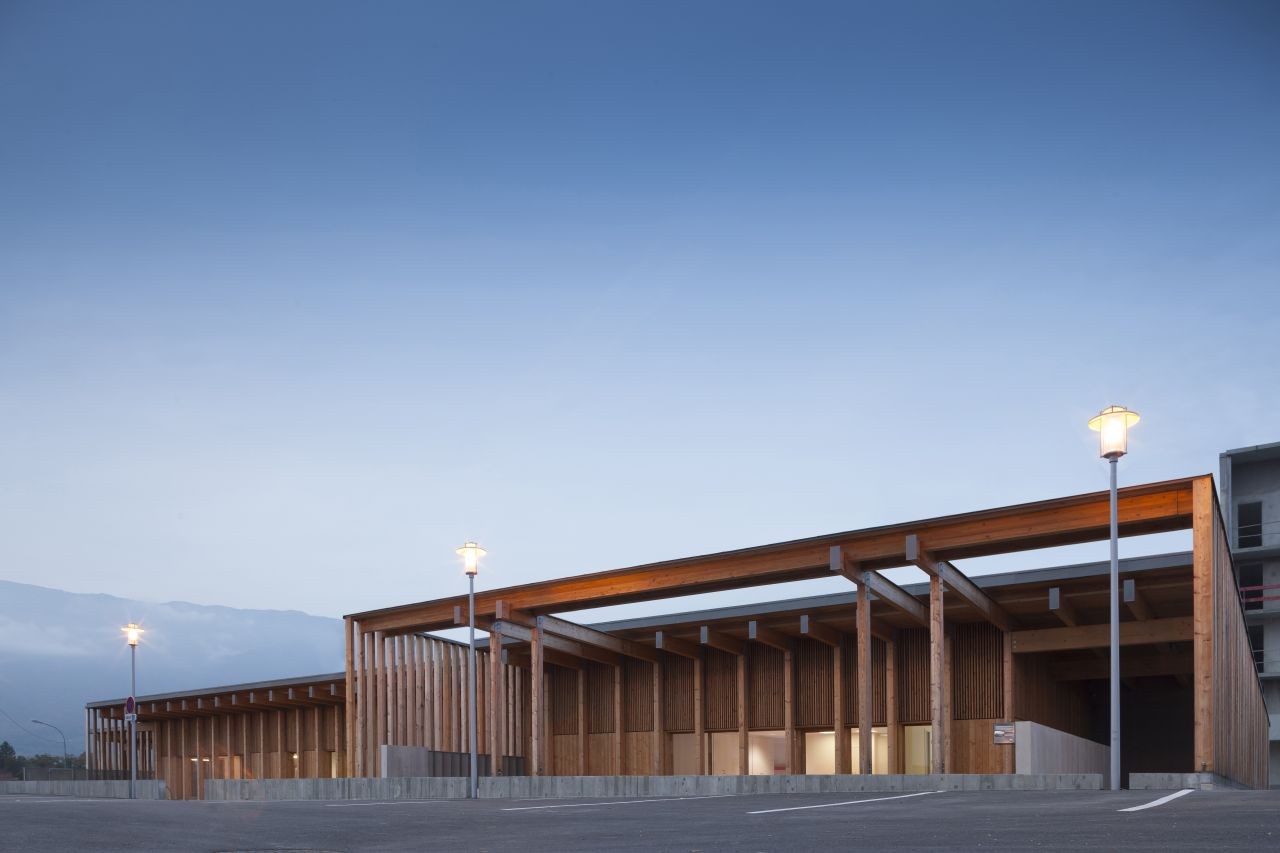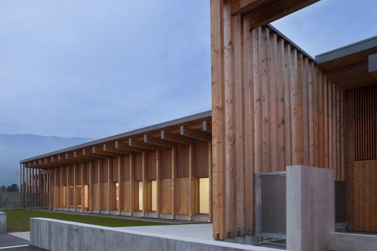 木材因生態與經濟而被選中。作為自然而可再生的材料,它對健康沒有任何風險,同時最大限度減少了碳排放。用于建筑的落葉松木可以采用高水平的預制,同時無論是建筑立面或其內部結構都不需要其他處理。北邊的木結構和天井與混凝土相結合,從而保證最優的保溫性能,同時尊重了防震需求。木結構間充滿了粉刷與亞麻,從而獲得了高性能保溫墻體。建筑的密封性從早期研究到建筑工地都一直得到了重點關注。