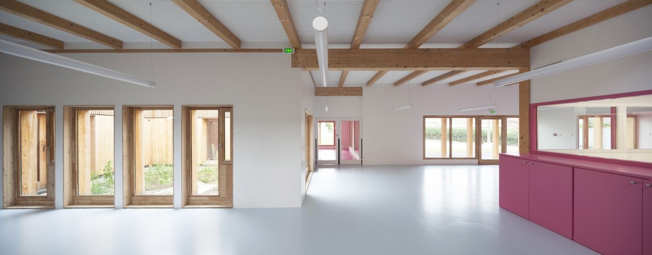 一所幼兒中心坐落在綠色而原始的圣格尼斯·普伊郊區,緊鄰著日內瓦與歐洲核子研究中心,并且正好位于法國與瑞士的邊界。在幼兒中心內部,木結構和自然光賦予空間以節奏。重復的結構允許精確裝配細節,因此這些細節也成為定義建筑室內的元素。白色粉刷墻和帶有顏色提示的設施整合了孩子們的玩具與家具。體量和與線條的簡單與適當的比例適應于孩子們的生活和視野,同時提供了寧靜而歡迎的設想,有意避免了任何“幼稚”的內涵。