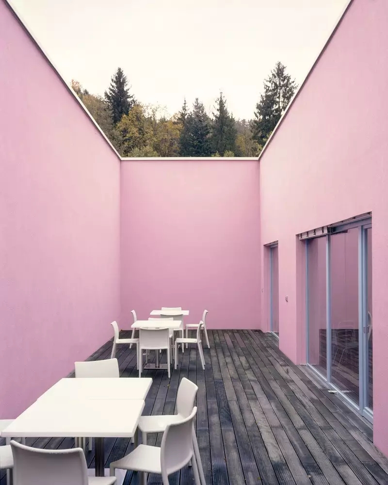 通過巧妙地對(duì)日托中心內(nèi)空間環(huán)境的結(jié)構(gòu)排列,例如散步區(qū)和寬敞的操場(chǎng)位置的安排,使日托中心呈現(xiàn)出了一種平面拉抻式的獨(dú)特空間感覺。在外觀表面的內(nèi)側(cè),則是一個(gè)封閉的景觀環(huán)境,一層半高的高度設(shè)計(jì),利用孔洞結(jié)構(gòu)提供了一個(gè)與外界主馬路相隔離的封閉式屋頂景觀。